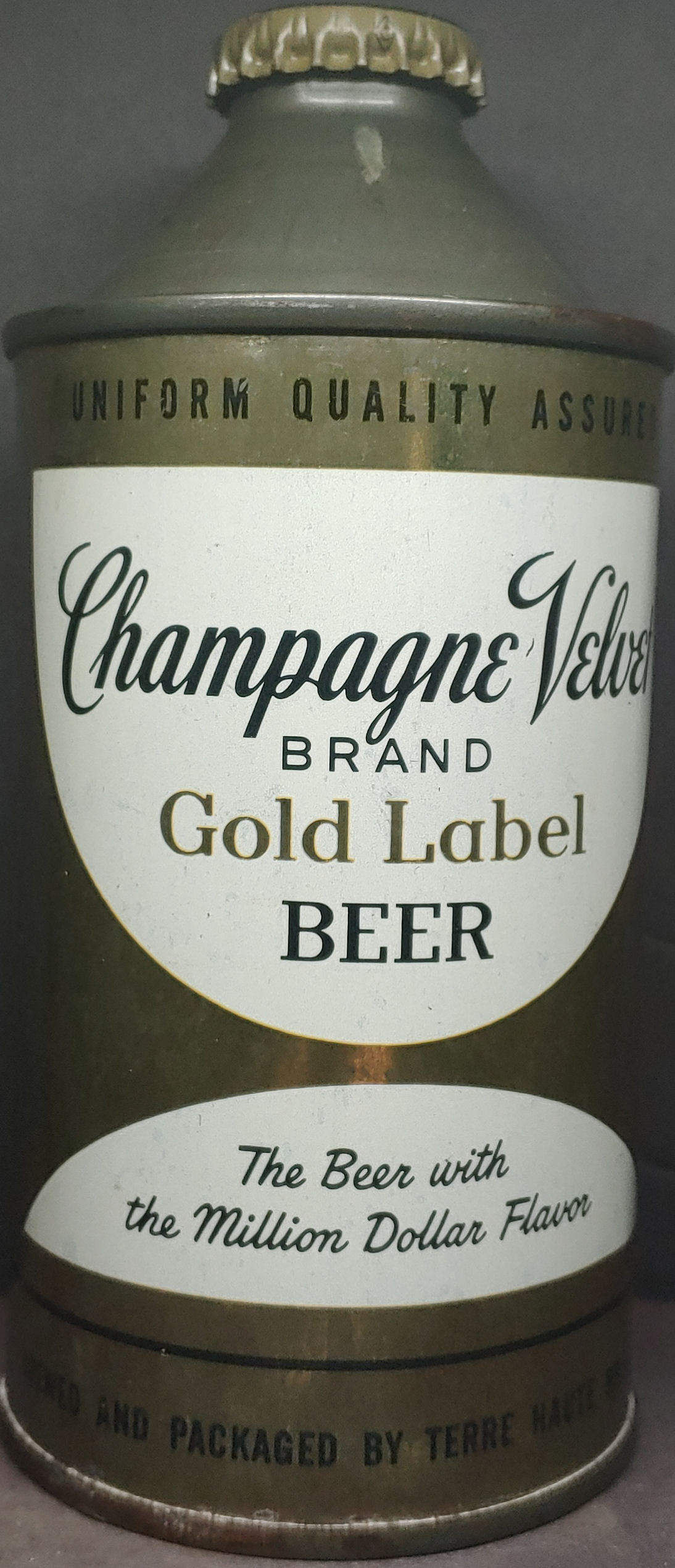 Champagne Velvet Brand Gold Label Beer cone top beer can Terre Haute IN Rare can most likely no indoor on grade known and maybe only 3-5 in this condition?