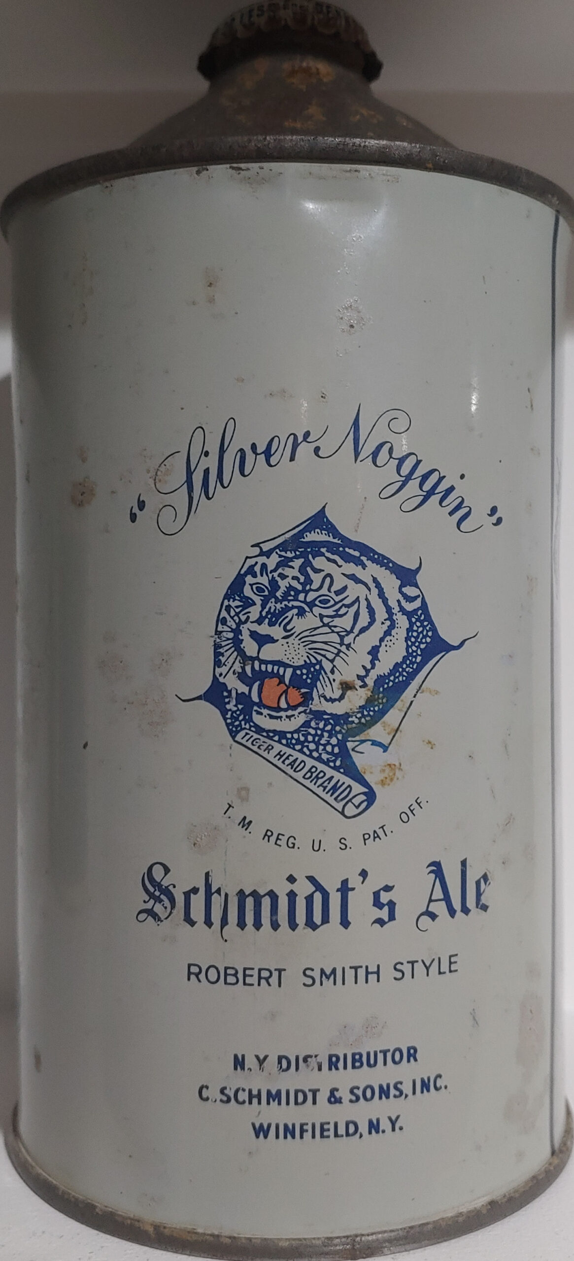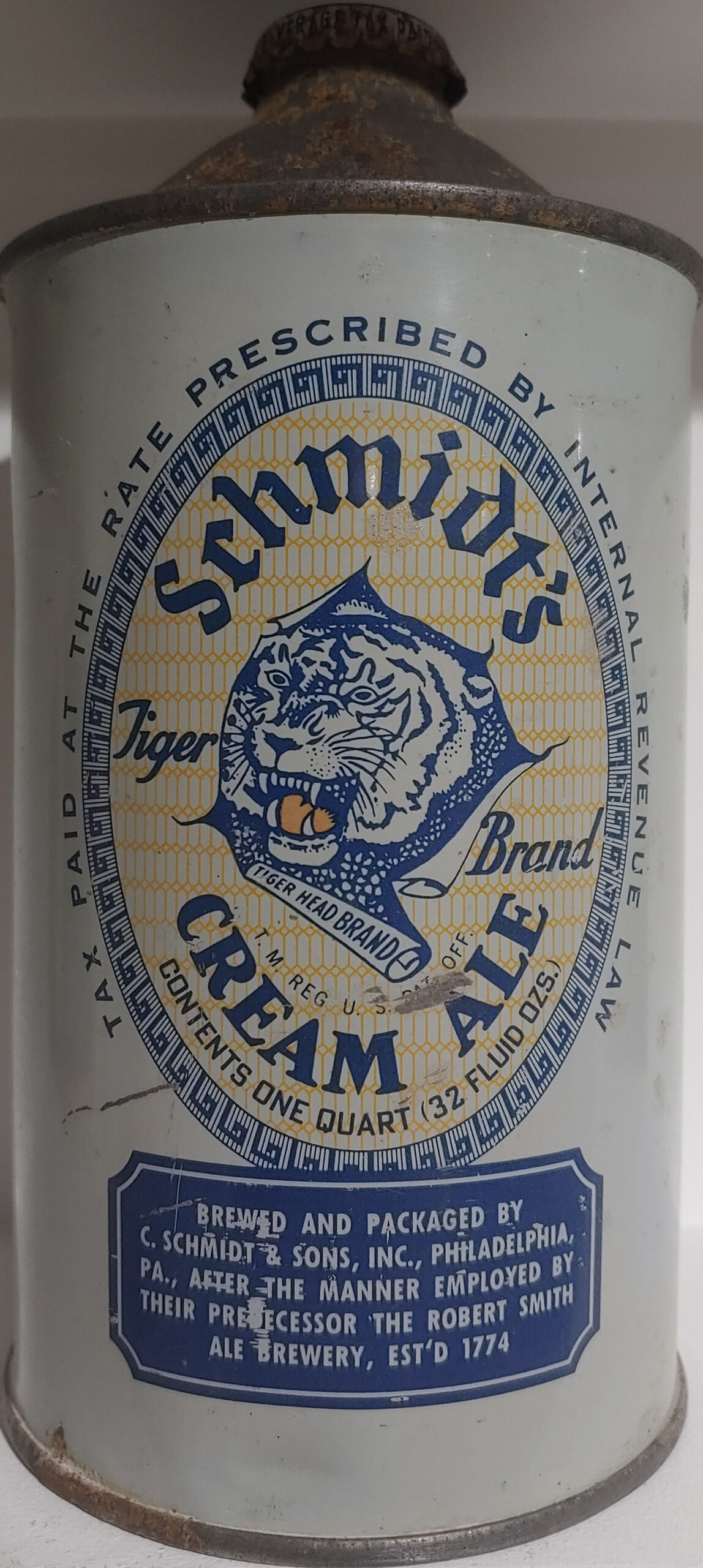 Schmidt’s Tiger Brand Cream Ale dull grey quart cone top beer can Philadelphia PA